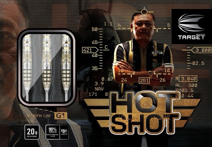 Target Japan Harith Lim Hot Shot G1 Swiss Point 90 % on premium-tason teräskärkinen darts-setti, suunniteltu aktiiviselle kilpailupelaajalle ja harrastajalle, joka vaatii tarkkuutta ja hallittua heittotuntumaa. 90 % tungsteenirakenne mahdollistaa ohuen barrelin, joka parantaa ryhmittelyä ja vähentää sivuttaisvastusta pudotuksissa.