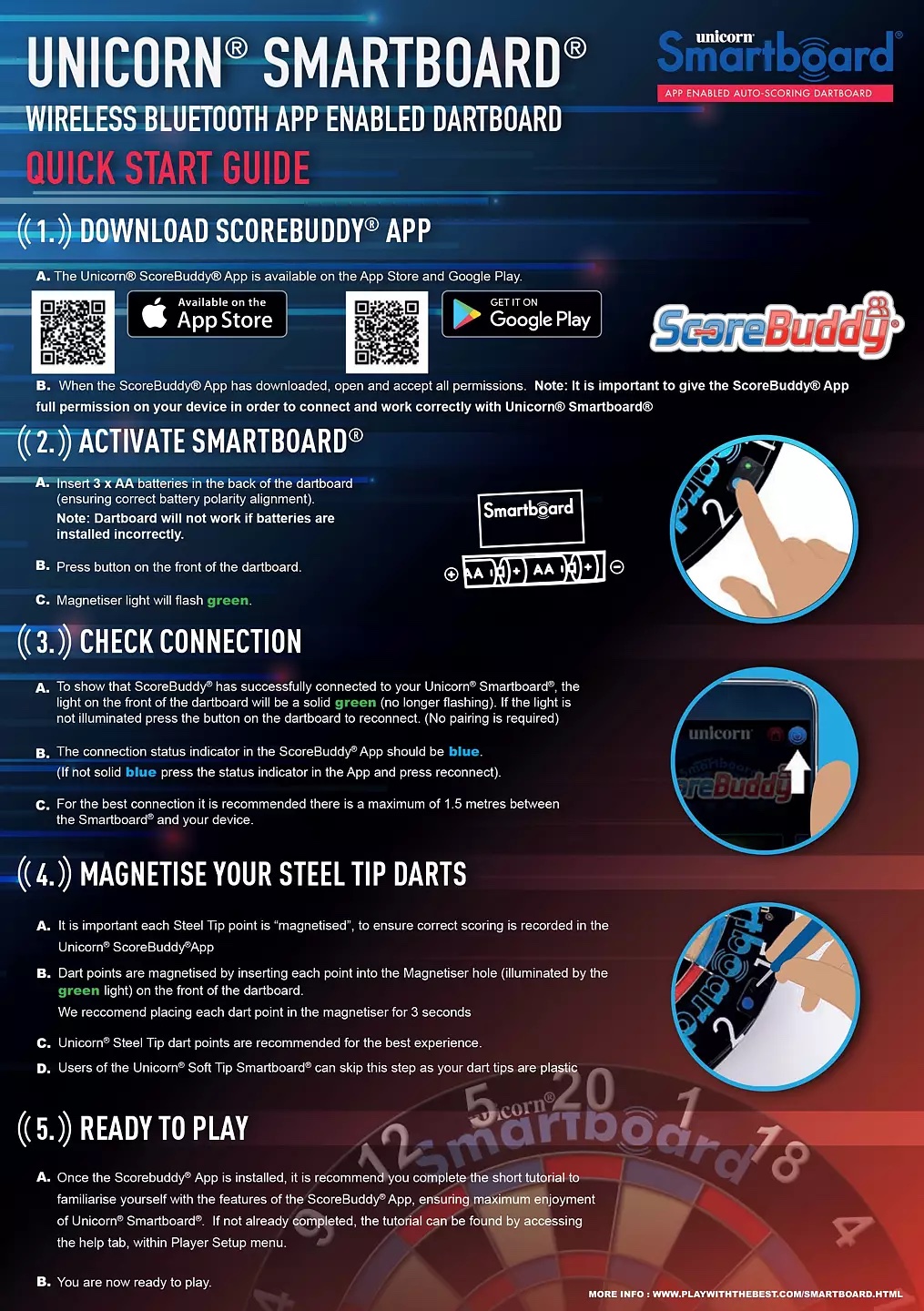 Smartboard-ominaisuus mahdollistaa automaattisen pistelaskun mobiilisovelluksen avulla. Taulu tunnistaa osumat ja siirtää pisteet langattomasti sovellukseen, josta löytyvät useat pelimuodot, kuten perinteiset 01-pelit, Cricket sekä viihdepelit useammalle pelaajalle. Tämä tekee taulusta erinomaisen vaihtoehdon niin harjoitteluun kuin rentoon pelaamiseen ystävien kanssa.